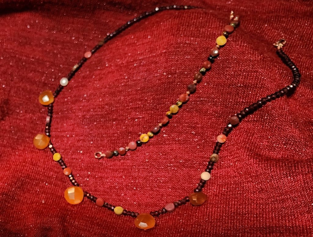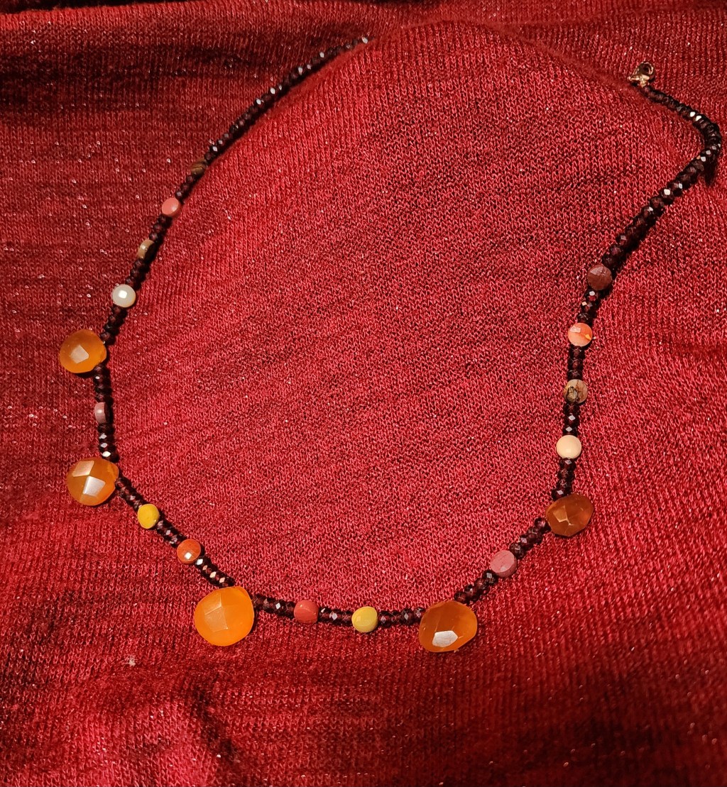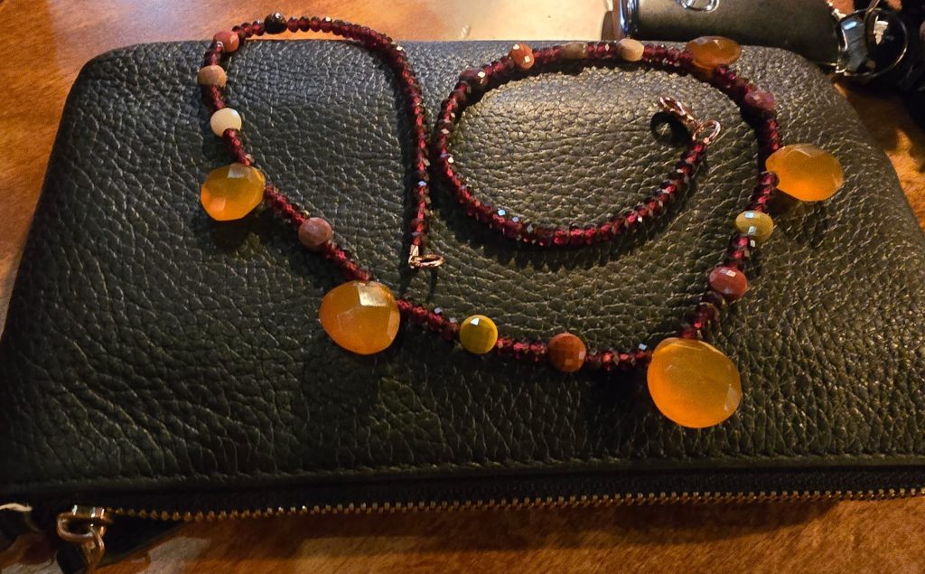 Golden Chalcedony, for warm communication, grounded in Mookaite Jasper nestled in shining faceted Garnet, symbolizing devoted friendship.