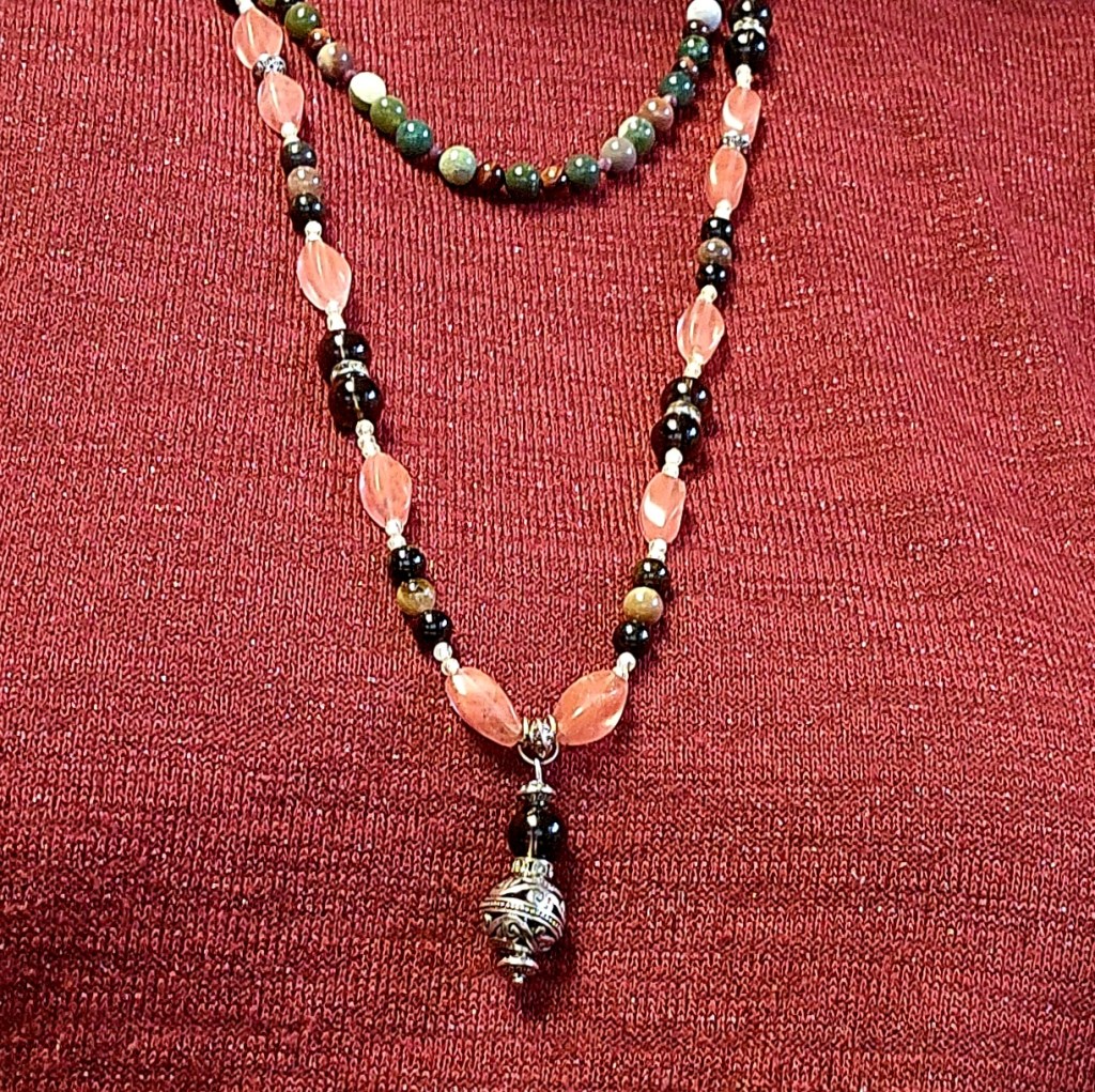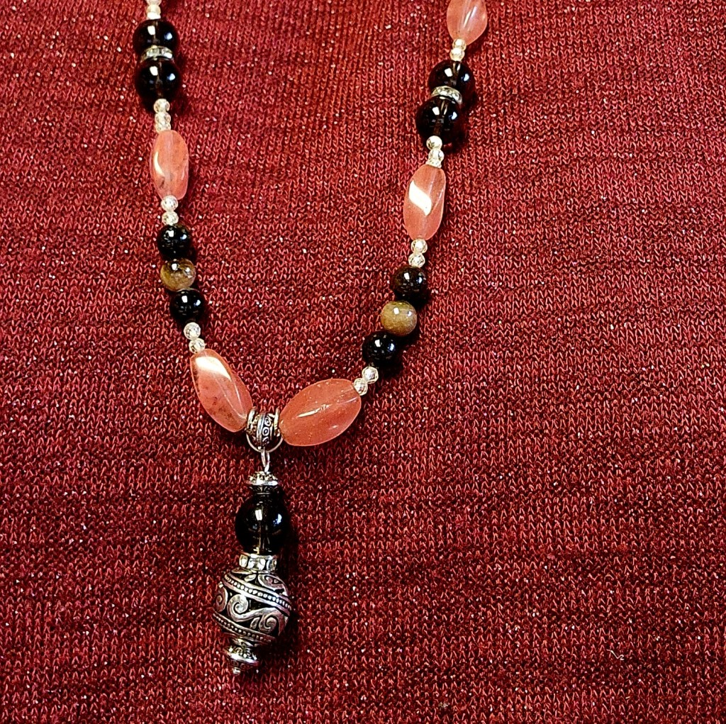 A joyfully positive mix of earthy Tourmaline and Smoky Quartz with elegant Cherry Quartz and Vintage Rhinestone wheels swirling down to a whirling silver filigree pendant, sprinkled with faceted lemon CZ ‘sugar’. Negativity be gone!