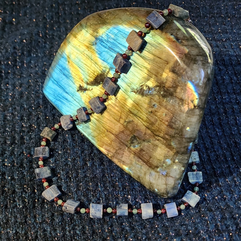Raw Kyanite, Garnet, and Jade with gold-plated clasp