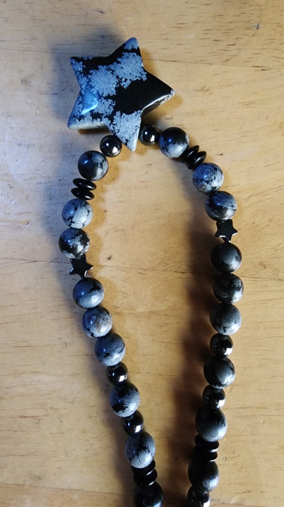 Snowflake Obsidian beads and star-shaped charm, Hematite beads and stars, Vintage Jet beads