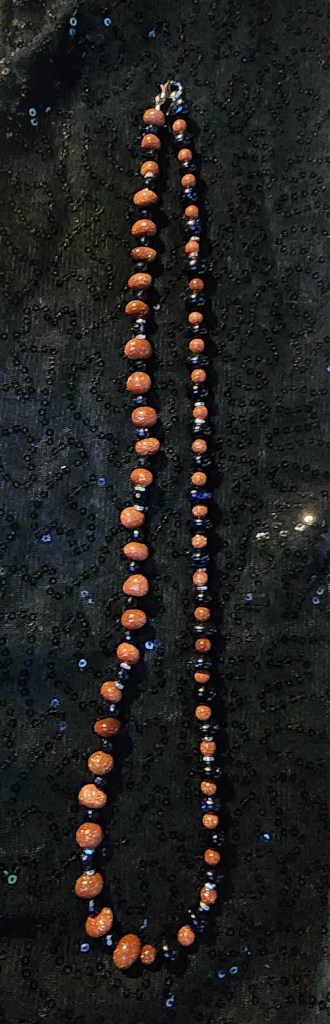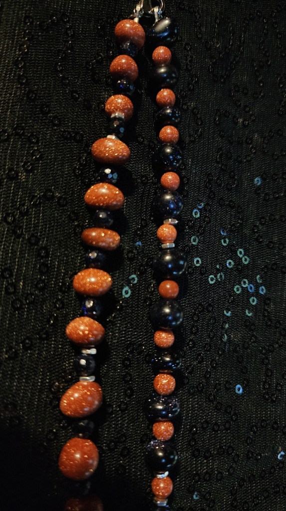 Large Goldstone pebbles and small Goldstone rounds, Large Blue Goldstone pebbles and small Blue Goldstone faceted beads, Silver Plated Hexagonal beads, Silver Plated Clasp and Crimp Covers